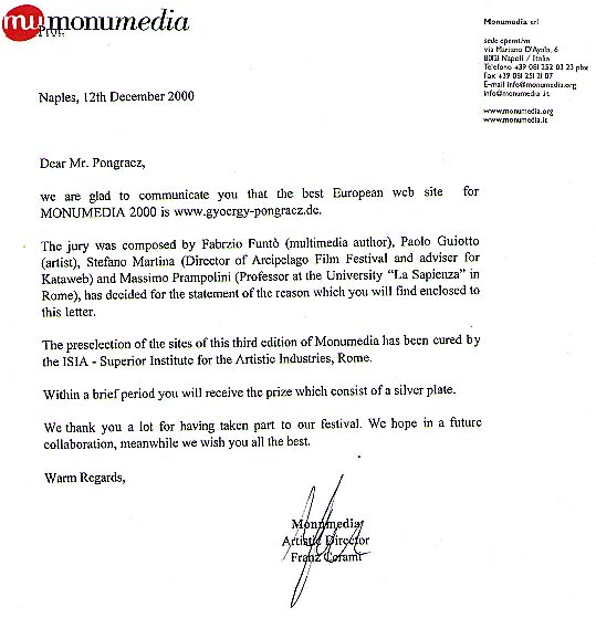 As part of the Monumedia First European Festival of Multimedia and Culture, Monumedia Co.Ltd. announces a National and European Prize for the best Internet site devoted to art and culture.